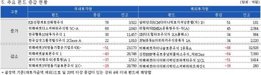 반면 과거 2~3년간 고수익을 올렸던 '미래에셋3억만들기좋은기업주식K- 1'(-51억원), '미래에셋솔로몬주식 1'(-43억원), '세이가치형주식(종류형)A 1'(-37억원), '미래에셋3억만들기솔로몬주식 1(C-A)'(-29억원) 등 펀드에서는 수익실현을 위한 환매가 이어졌다.