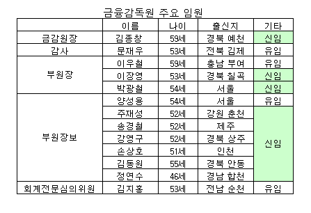 특히 핵심 보직인 전략기획과 경영지원 분야는 이우철 부원장, 손상호·김동원 부원장보 등 모두 외부출신이 장악했다. 내부 출신으로는 개혁이 쉽지 않다는 점을 감안한 조치로 해석된다. 단적으로 금감원에 대한 새 정부의 불신이 어느 정도인지 확인된 셈이다.