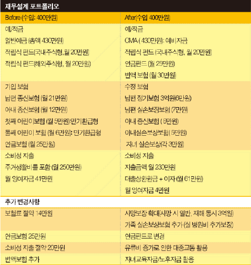 A: 주택담보대출에 대한 상환계획을 5년에서 15년으로 늘릴 필요가 있습니다. 현재 담보대출 금리가 연 6.5%임을 감안하면 5년 상환 시 매달 137만원 정도의 원리금을 갚아야 하므로 수입(세후 월 400만원) 대비 34.3%를 차지합니다. 소비를 줄이지 않는 한, 생활유지가 힘든 상황이 생길 수 있습니다. 더군다나 내년에 둘째아이를 어린이집에 보낼 경우 월 40만원 정도의 고정지출이 추가되므로 현금 흐름이 마이너스로 됩니다. 따라서 주택담보대출을 15년으로 장기 분할상환하는 것이 해결책입니다. 그렇게 되면 상환금액이 월 61만원 정도로 낮아지고 연말정산 시 장기주택저당 차입금 공제를 통해 상환금액에 대해 전액 세금공제를 받을 수도 있습니다.