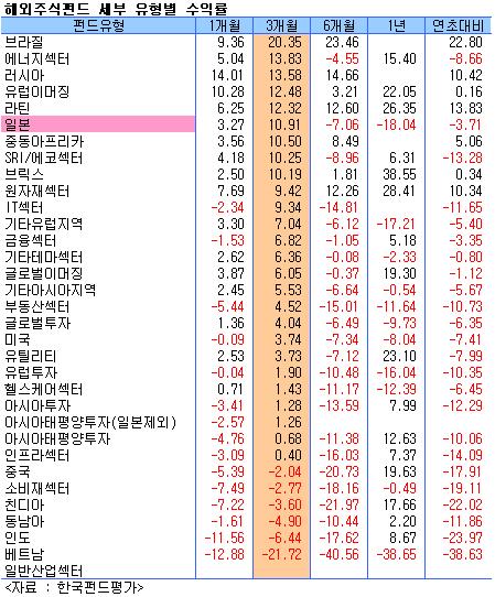 6일 한국펀드평가에 따르면 지난 4일 기준 50억원 이상 일본펀드의 3개월 평균수익률은 10.91%를 기록했다. 지난 1년간 수익률은 -18.04%로 베트남과 유럽을 제외하면 가장 낮은 수준이지만 최근 3개월은 브라질, 러시아 등 자원부국에 이어 반등세가 가장 두드러진다.