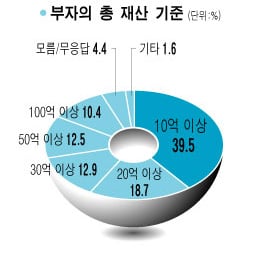 금융자산과 부동산 등을 포함해 얼마 정도 있어야 부자라고 생각하느냐는 질문에 '총자산 10억원 이상'이 39.5%로 가장 많았다. 그 다음은 '20억원 이상'(18.7%), '30억원 이상'(12.9%), '50억원 이상'(12.5%), '100억원 이상'(10.4%) 순이었다.