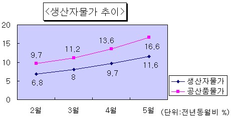 품목별로는 유가 상승으로 공산품이 작년 같은 달보다 16.6% 급등하면서 지난 98년 4월(17.8%) 이후 가장 높은 수준을 보였다.