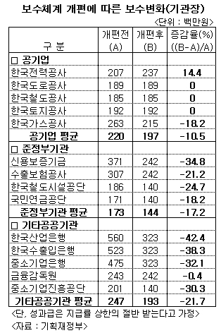 감사의 평균 연봉은 1억7600만원에서 1억2900만원으로 26.7% 낮아진다. 기타공공기관의 경우 2억6400만원에서 1억7000만원으로 35.8% 감소한다.