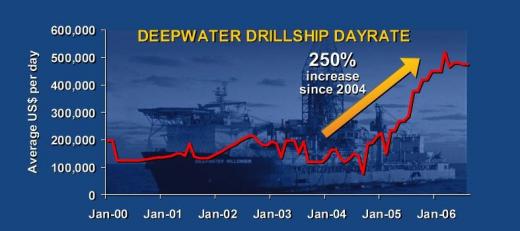 배가 워낙 부족하다보니 멕시코만지역의 심해 시추선을 하루 이용하는 비용은 2002년 15만달러에서 현재 60만달러로 4배 뛰었다. 선주 입장에서는 수입이 최고치로 불어났다는 의미다.
