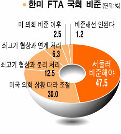 우선 한·미 FTA의 국회 비준에 대해 응답자의 47.5%는 '경제에 도움이 되므로 서둘러 비준해야 한다'고 답했다. 이어 30%는 '미국 의회의 상황을 지켜보면서 시기조절이 필요하다'며 다소 신중한 모습을 보였다. 그러나 비준을 반대하는 응답자는 극소수(1.2%)였고, 미국 의회의 선 비준 후 국회가 비준해야 한다는 답변도 2.5%에 그쳤다.