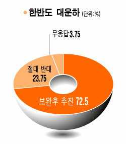 반면 대운하 건설계획에 대한 응답자들의 반응은 대체로 '부정적'이었다. '전문가 등의 의견을 좀더 수렴한 후 보완해서 추진해야 한다'는 답변이 전체의 72.5%를 차지했고, '절대 건설해서는 안된다'는 반대의견도 23.8%에 달했다. 그러나 '무조건 대운하를 건설해야 한다'는 항목을 선택한 응답자는 1명도 없었다.