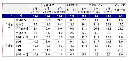 지난 10일 실시된 1차조사에서는 '이인규(12.1%)-공정택(10.3%)-주경복(9.2%)'의 순으로 나타났으나, 2차조사(13일)에서는 '공정택(12.0%)-이인규(11.5%)-주경복(8.8%)'으로 순위가 역전됐고, 3차에서는 '공-주' 양강 체제를 보였다. 공 후보의 경우 완만한 지지율 상승세를 보인 반면, 주 후보는 급상승세를 나타낸 것.