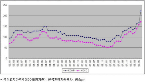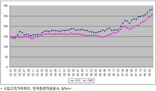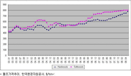 주요 원재료인 펄프와 고지의 2003년 이후 가격추이를 살펴보면 추세적인 상승을 하고 있음을 알 수 있다. 특히 고지의 경우 2007년 1분기까지 안정된 모습을 보이다가 그 이후 급등 양상을 연출하고 있다. 수입고지의 경우 최근 1년간 23.6%의 상승률을 기록하였고 국산고지의 경우에는 수도권을 기준으로 최근 1년간 무려 약 114%의 상승률을 기록하고 있다.