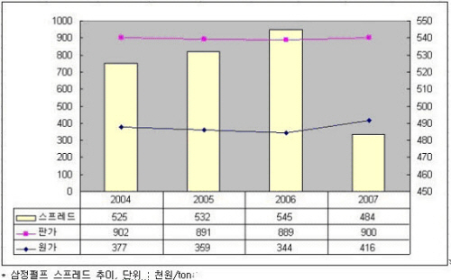 삼정펄프는 내수매출 비중이 99%에 달하기 때문에 수출제품의 16.6% 가격인상은 큰 의미가 없다고 볼 수 있고 두루마리와 티슈 등 완제품의 경우 오히려 제품가격이 2007년 각각 12%, 32% 하락하였다. 이로 인해 원가와 판가사이의 스프레드는 급격히 축소되는 모습을 보이고 있다.