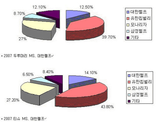 국내 위생용지산업은 유한킴벌리와 한국P&G 등의 다국적기업이 시장을 주도해 왔다. 그러다가 대한펄프, 모나리자, 삼정펄프 등 국내 기업이 가세하여 현재 일관 가공라인을 보유하여 완제품을 공급하는 대형 5개 회사 및 일관가공시설이 없는 중소형 25개 회사가 포진하여 전체적으로 30개사가 경쟁하고 있다.