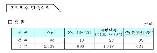 관세청은 지난 5월부터 7월까지 기업형 조직밀수에 대한 특별단속을 실시한 결과, 4012억원 규모의 27개 조직, 120명이 검거됐다고 12일 밝혔다. 전년동기 대비 건수로는 2배, 금액으로는 6배 증가한 수준이다.
