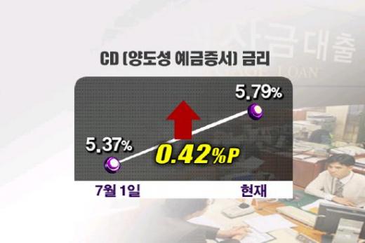 사당동에 사는 이모씨는 현재 살고 있는 아파트를 사기 위해 몇 년전 은행으로부터 담보대출 1억 8000만원을 받았다. 이 씨가 지난해 8월 적용받은 대출금리(변동형)는 6.78%. 현재(8월19일) 대출 금리는 7.3%로 일년 사이에 0.52%포인트 올랐다. 하지만 지난 7일 한은의 금리인상 이후 CD금리가 0.42%포인트나 올라 8월 하순에 조정될 금리는 더욱 높아질 전망이다.