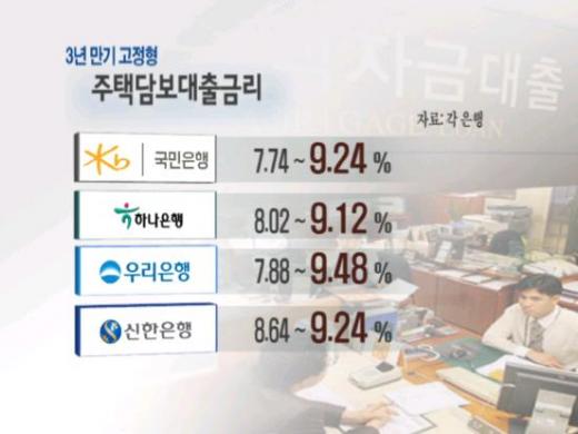 실제로 현재 시중 은행의 금리는 계속 오르고 있다. 대출금리의 기준이 되는 CD금리가 지난달에 비해 0.4%포인트 이상 오르면서 CD금리와 연동되는 변동형 주택담보대출금리를 계속 끌어올리고 있다. 현재 국민, 신한,우리, 하나 은행 같은 대표적인 은행들의 고정형 금리는 7%후반에서 9%대까지 올라 있는 상태다.