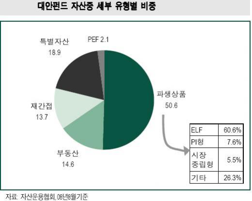 30조원 규모로 대안펀드의 절반(50.6%)을 차지하는 파생상품중에서 가장 큰 비중을 차지하는 것이 ELF(주가연계펀드)다.