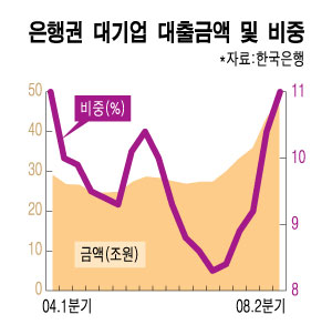 기업대출 가운데 대기업이 차지하는 비중은 2004년 1분기 이후 지속적으로 하락하다 2005년 2분기 9.3%까지 내려갔다. 이후 2005년 3·4분기에 다시 상승세로 돌아서 10.4%까지 높아졌다. 하지만 곧바로 떨어져 작년 1분기에는 8.3%까지 하락했다.
