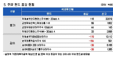 해외펀드는 미래에셋운용의 미래에셋인사이트혼합형자 1Class-F로 28억원, 미래에셋KorChindia포커스7주식 1(CLASS C-I)로 27억원이 유입된 것을 제외하면 두드러진 증가를 기록한 곳이 없었다.