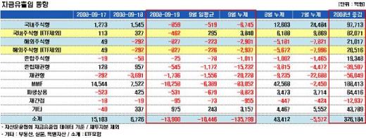 한편 대규모 자금이 유입됐던 MMF는 1조258억원이 빠져나갔고, 채권형펀드와 혼합형펀드에서도 각각 1736억원, 570억원이 증발했다.