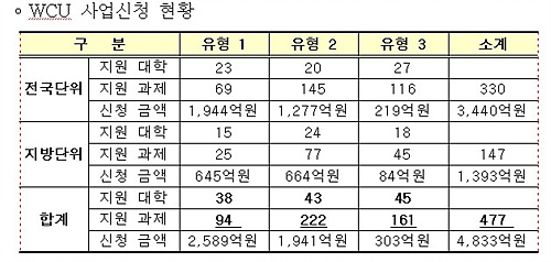 교육과학기술부는 지난 20일 WCU 육성사업 접수를 마감한 결과 66개 대학에서 모두 477개 과제를 신청해 평균 경쟁률이 4대 1을 기록했다고 23일 밝혔다.