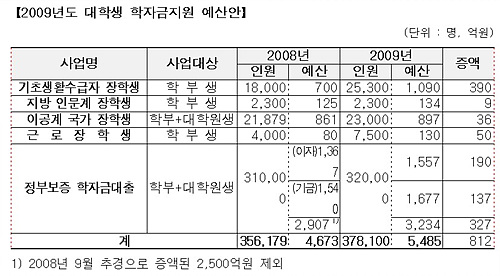 교육과학기술부는 2009년도 학자금 지원 예산을 올해보다 812억원(17.4%) 늘어난 5485억원으로 편성해 국회에 제출했다고 30일 밝혔다.