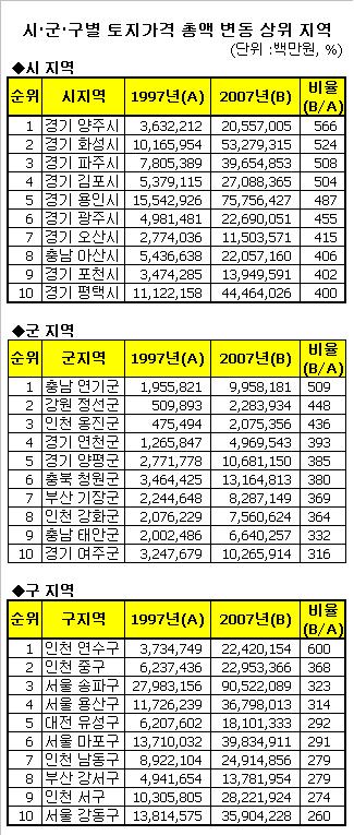 군 지역의 경우 충남 연기가 5.09배로 최고 상승률을 기록했으며 강원 정선(4.48배) 인천 옹진(4.36배) 경기 연천(3.93배) 등이 상위권에 올랐다. 구 단위에서는 인천 연수가 6.00배 뛰어 최고치를 보였고 인천 중구(3.68배) 서울 송파(3.23배), 용산(3.14배) 등이 높은 땅값 상승률을 나타냈다.