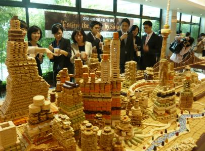 현대백화점(109,800원 ▼1,100 -0.99%)무역센터점은 오는 19일까지 중국 현대예술 작가 '송동'이 전통·현대·문화가 어우러진 아시아의 역동적인 도시의 모습을 과자와 설탕으로 제작한 작품인 'Eating the city'를 전시한다.