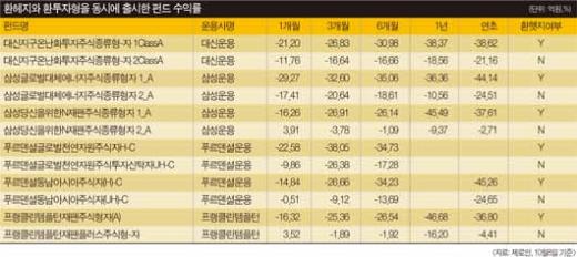 실제 같은 자산운용사에서 운용하는 동일한 유형의 펀드라 해도 환헤지 여부에 따라 수익률의 명암은 대조적으로 갈리고 있다. 대개 20% 이상의 극명한 수익률 차이가 나타나고 있다.