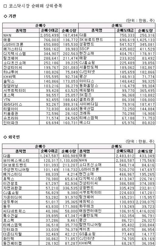 기관은 외국인이 팔아치운 NHN을 주워 담았다. 순매수 규모는 205억원 어치로 가장 많이 사들였다. 기관은 또 태웅(77억원), LG마이크론(65억원), 메가스터디(59억원), 디지텍시스템(34억원) 순으로 많이 사들였다.