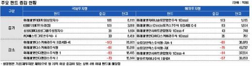 해외 펀드는 '미래에셋차이나솔로몬법인주식 1ClassI'(123억원), '미래에셋KorChindia포커스7주식 1(CLASS C-I)'(83억원), '미래에셋인사이트혼합형자 1Class-F'(43억원) 등 법인 자금이 들어온 데 반해 '슈로더브릭스주식형-자A-1'(-86억원), '슈로더브릭스주식형-자E'(-76억원), '미래에셋인사이트혼합형자 1Class-A'(-64억원)에선 자금이 빠져나갔다.