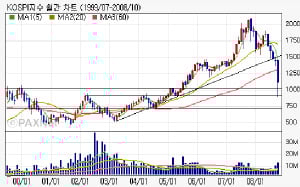 일단 월봉상 계속 강조했던 깨지 않던 추세선은 깨진 상황, 저 위로 다시 올라가야 하는데 단기간에 올라갈지 아니면 이 아래서 다시 추세를 만들지를 살펴야 한다. 큰 그림상에서 겨우 지지가 일어날 수 있는 구간에서 일단은 급반등을 만들며 한 숨 돌린 모양인데 어차피 요즘 시장은 파생 시장에 의해 휘둘리고 있으므로 선물 매도와 선물 매수 세력간의 힘겨루기가 어떻게 이어질지 사뭇 궁금한 시점이다.