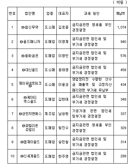 신규 공개 고액체납자 상위 10위(법인) ⓒ국세청 독자들의 PICK! "아내에 남편·딸 있었다" 결혼 후 충격...더 놀라운 진실 김신영, 8년 열애 끝 결별 고백…"전남친 어머니와는 계속 연락" '14살 차이' 배성재·김다영, 결혼 1년 만에 위기? "밤마다..." "맨날 씨뿌리고 다녀" 박정수, 75세에 늦둥이 본 김용건 '일침'