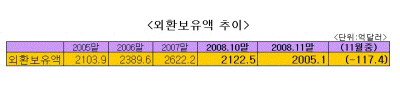 한국은행이 3일 발표한 '11월말 외환보유액'에 따르면 지난 11월말 외환보유액(이하 보유액)은 2005억1000만달러로 10월말에 비해 117억4000만달러 감소했다.