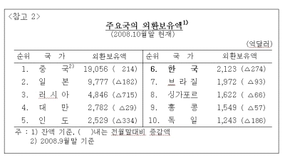 한국의 보유액 규모는 중국 1조9056억달러, 일본 9777억달러, 러시아 4846억달러, 대만 2782 억달러, 인도 2529억달러에 이어 세계 6위를 유지했다. 보유액은 유가증권 1821억5000만달러, 예치금 176억5000만달러 등으로 구성돼 있다.