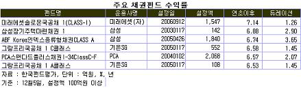 신용위기가 부각되면서 은행채나 회사채 편입 비중이 높은 채권펀드는 수익률이 부진했다. 회사채 편입 비중이 상대적으로 높은 ‘아이러브평생직장채권3 CLASS C2’와 ‘도이치코리아채권1-1 CLASS A’는 각각 2.97%, -2.04%를 기록했다.