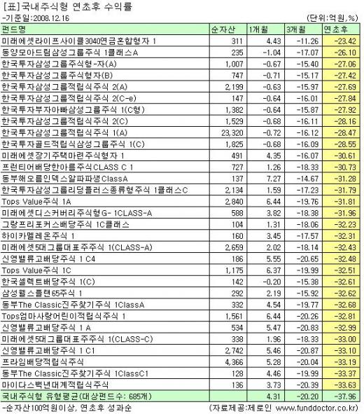 순자산 100억원 이상 국내 주식형펀드 가운데 연초 대비 수익을 낸 상품은 전무했다. 685개의 국내 주식형펀드가 평균 38%의 손실을 기록한 가운데 삼성그룹주 펀드가 상대적으로 양호한 실적을 올린 것으로 나타났다.