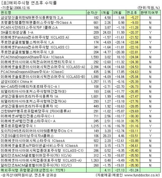 해외주식형펀드도 한해 동안 수익을 내지 못하기는 마찬가지. 순자산 100억원 이상 해외주식형펀드의 평균 수익률은 마이너스 50%. 한해 동안 반토막이 난 셈이다.