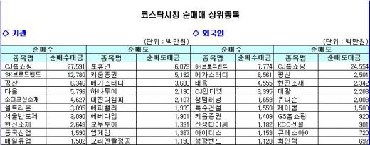반면 외인들은 CJ홈쇼핑과 평산,현진소재,태광,유니슨 등 단조종목을 대량매도했다. 제이콤과, GS홈쇼핑, KCC건설 등도 외인의 매도타깃이 됐다.