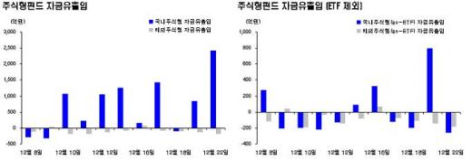 그러나 ETF를 제외한 순수 국내주식형펀드는 264억원이 순유출돼 하루만에 자금 흐름이 반전됐다. 전날 1300억원에 이르던 신규 설정액이 300억원대로 쪼그라들었다.