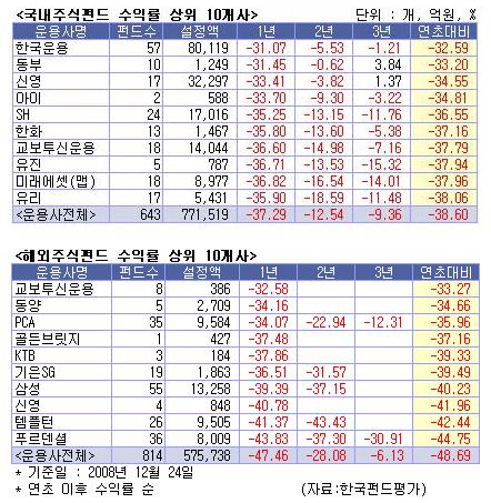 해외주식형펀드의 강자였던 슈로더투신운용(―47.27%)과 신한BNP파리바투신(―48.70%), 피델리티(-50.34%)도 순위권 진입에 실패했다.