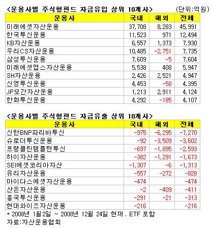 자산운용협회에 따르면 2008년 1월 2일부터 12월 24일까지 미래에셋으로 4조5991억원이 순유입됐다. 이는 전체 주식형펀드 순유입액 11조2736억원 중 41%에 달한다. 외국인과 기관이 차익거래로 활용하는 상장지수펀드(ETF)를 제외하면 미래에셋의 비중은 54%로 독보적이다.