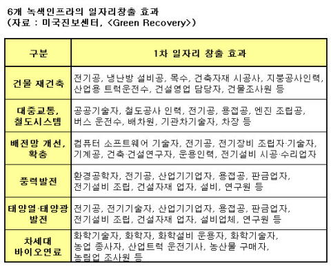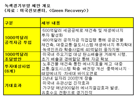 브루킹스연구소와 함께 미국의 진보진영 싱크탱크 중 하나로 손꼽히는 미국진보센터(CAP, Center for American Progress)가 지난 9월에 내놓은 '녹색 경기회복(Green Rocovery)-일자리 창출 및 저탄소 경제 구축방안' 보고서 내용이다.
