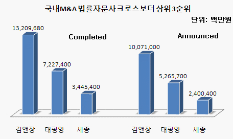 크로스보더 M&A는 김앤장의 독주아래 태평양과 세종이 뒤를 이었다.