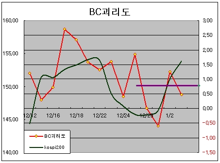 BC괴리도 그림은 시장 베이시스와 이론 베이시스의 차이를 나타낸 그림으로 확대되면 프로그램 매수가, 축소되면 매도가 출회될 가능성을 나타낸 것이다.