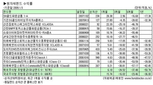 지난 해 7월 유가는 배럴당 145달러를 웃돌았다. 그러나 이를 고점으로 하반기엔 배럴당 30달러대까지 추락했다. 금값은 온스당 1000달러를 돌파한 이후 700달러를 저점으로 등락을 반복했다. 옥수수와 밀도 지난 해 고점대비 각각 73%, 46% 빠진 상태다. 이에 따라 순자산 50억원 이상인 원자재펀드 22개의 1년 수익률은 -17.3%~-53.5%로 저조하다.