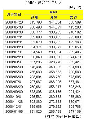 단기간 막대한 자금이 일부 운용사의 MMF로 집중되면서 이들 운용사들은 비대해진 MMF 운용에 어려움을 호소하는 실정이다. 자산운용협회에 따르면 지난 해 9월말부터 1월 5일까지 MMF로 유입된 자금은 31조720억원. 이 기간 삼성투신운용의 MMF 설정액이 17조4867억원으로 가장 많이 증가했고, 신한BNP파리바자산운용(5조4770억원)과 산은자산운용(3조3388억원), 한국투신운용(2조4165억원) 등이 뒤를 이었다.