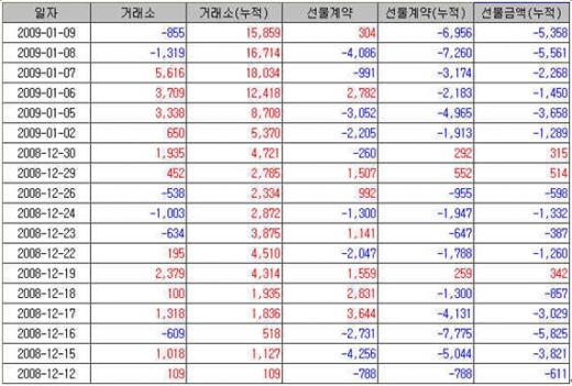 아래 그림은 지난 동시 만기일(작년 12월 11일)이후 주식(거래소)시장과 선물시장에서 외국인 투자자들이 보여준 수급 현황이다.