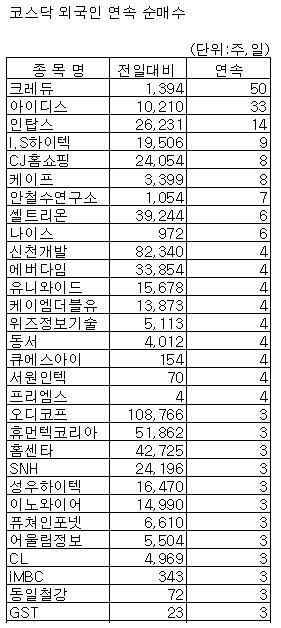 [표]코스닥 외인 연속순매수 종목-14일