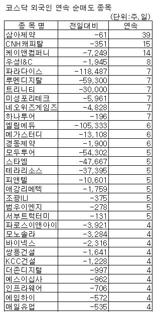 [표]코스닥 외인 연속순매도 종목-14일