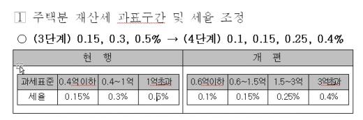 주택 재산세 과세표준과 세율은 △6000만원 이하 0.1% △6000만원 초과~1억5000만원 이하 0.15% △1억5000만원 초과~3억원 이하 0.25% △3억원 초과 0.4%로 세분화되고 인하조정된다.