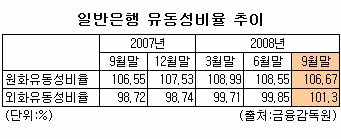 한편 일반 은행의 외화유동성비율은 2007년말 98.7%에서 지난해 9월 말 101.3%로 높아졌다.