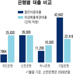 약속어음 등 신용증권은 신용도가 국채나 통안증권에 비해 크게 떨어져 리스크 관리 차원에서 실물을 확인해야 한다는 논리다. 국민은행은 실물이 있는 할인어음대출은 7864억원에 불과하나 외상매출채권대출은 2조5830억원에 달한다. 신한은행은 각각 2조6000억원으로 같고 하나은행은 1조1200억원, 1조6500억원으로 외상매출채권대출이 더 많다. 기업은행은 지난해말 현재 할인어음은 4조2642억원, 외상매출채권대출은 2조2418억원이다.